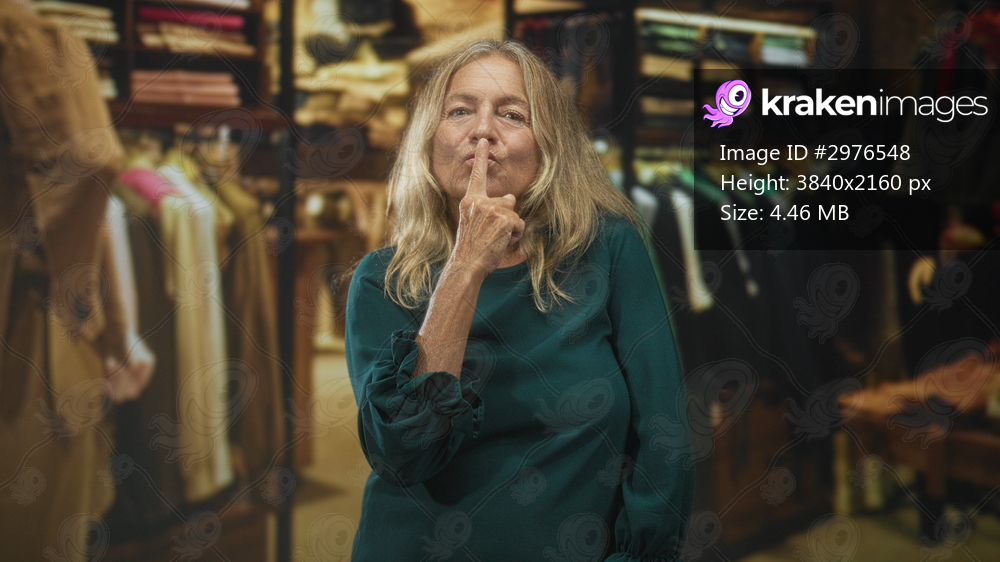 Senior blonde woman puts finger to lips shushing then gives thumb up amid racks of clothes in a boutique clothing store, smiling while browsing; playful. - Kraken Images