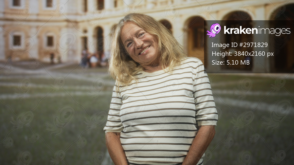 Senior blonde woman smiling with hands clasped and head tilted, standing in front of a stone building with arched colonnade and cobbled courtyard; serenity warmth. - Kraken Images