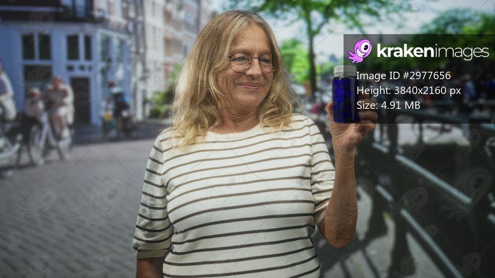 Senior blonde woman smiling and holding a blue medicine bottle in her right hand on a street by a canal railing with blurred pedestrians; health confidence wellness. - Kraken Images