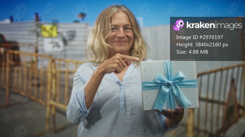 Senior blonde woman smiling, pointing finger at gift box on street while holding a blue ribboned present; celebration joy.