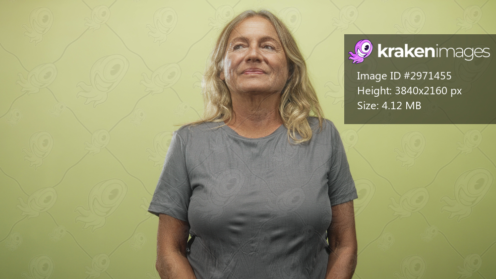 Senior blonde woman touching her head with hand and closed eyes in studio portrait, visible arm and shoulder gesture; serene reflection.