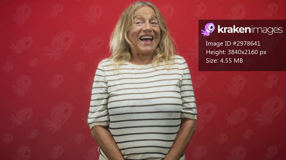 Senior blonde woman wearing a striped sweater, hands clasped in front, head bowed and lips pressed, standing against red backdrop in studio; quiet reflection. - Kraken Images