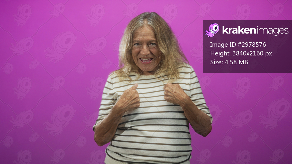 Senior blonde woman wearing striped shirt points finger to camera with open mouth and visible hand gesture in studio with magenta backdrop; playful.