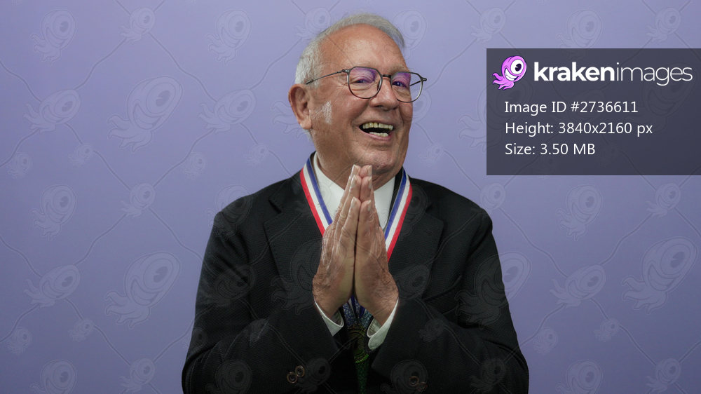 Senior business man with glasses in a suit smiling and clasping hands wearing a medal against a purple wall background isolated, evoking a celebratory and successful mood. - Kraken Images
