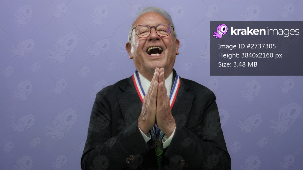 Senior business man with glasses in a suit smiling and clasping hands wearing a medal against a purple wall background isolated, evoking a celebratory and successful mood. - Kraken Images