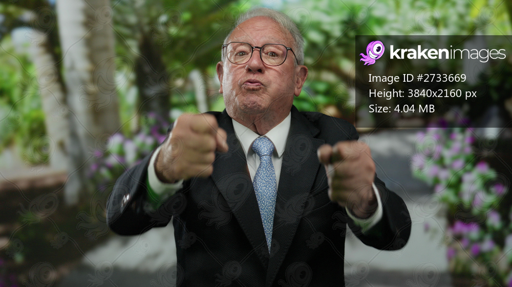 Senior business man in a suit angrily gesturing with fists in a green outdoor park setting, showcasing frustration and emotion.