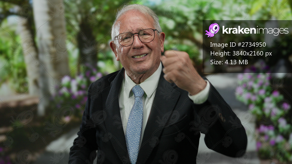 Senior business man in a suit angrily gesturing with fists in a green outdoor park setting, showcasing frustration and emotion.