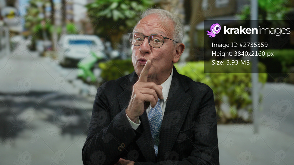 Senior business man in a suit gestures outdoors on a sunny street background, illustrating a dynamic and professional urban setting.