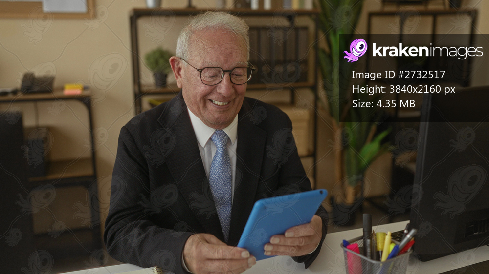 Senior businessman in a suit having a video call on a tablet, smiling in a modern office setting with plants and office supplies creating a professional but warm atmosphere. - Kraken Images