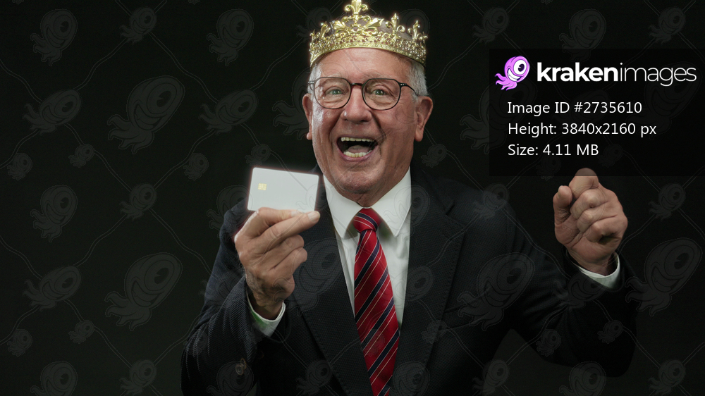 Senior businessman in suit and crown, laughing while holding a credit card, isolated against black background, symbolizing financial success and leadership. - Kraken Images