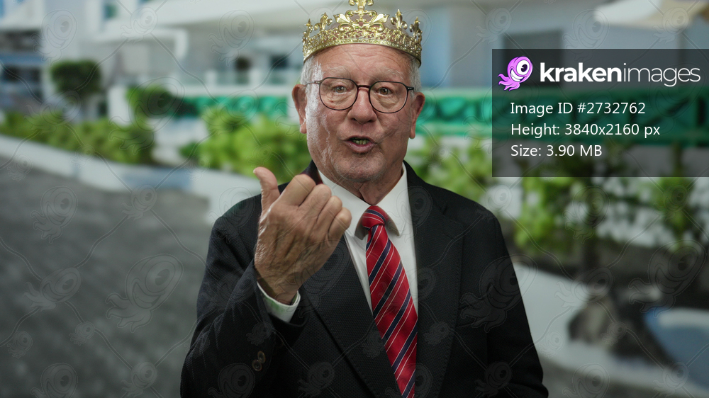 Senior businessman wearing a suit and crown gestures invitingly on an outdoor street, blending elegance with playfulness while pointing to the side amidst greenery and urban backdrop. - Kraken Images