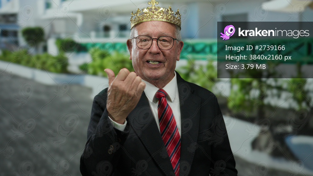 Senior businessman wearing a suit and crown gestures invitingly on an outdoor street, blending elegance with playfulness while pointing to the side amidst greenery and urban backdrop. - Kraken Images