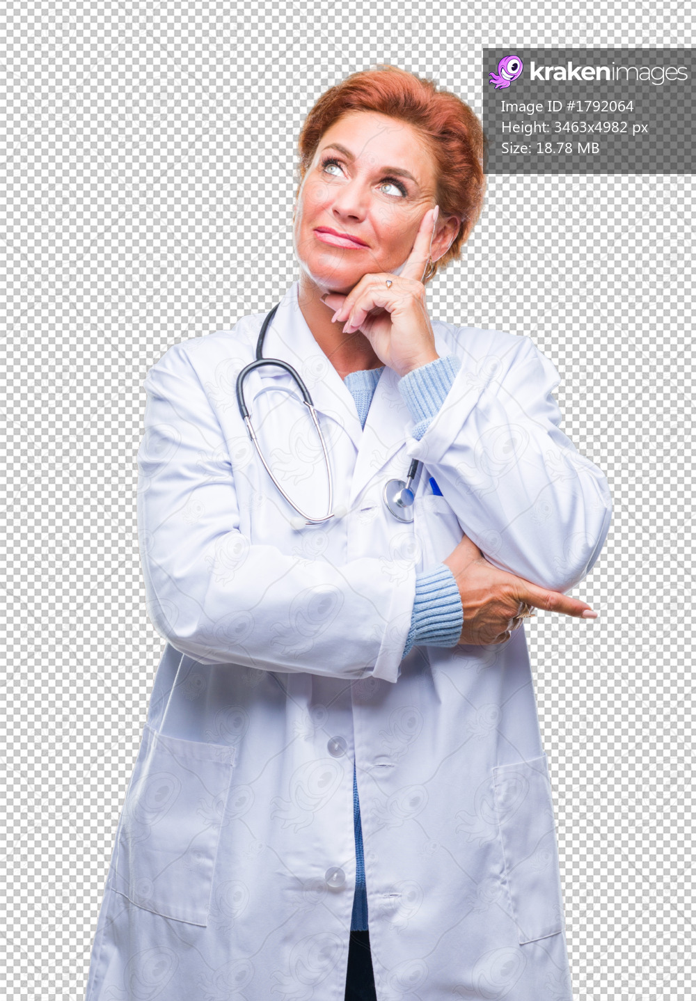Senior caucasian doctor woman wearing medical uniform over isolated background with hand on chin thinking about question, pensive expression. Smiling with thoughtful face. Doubt concept. - Kraken Images