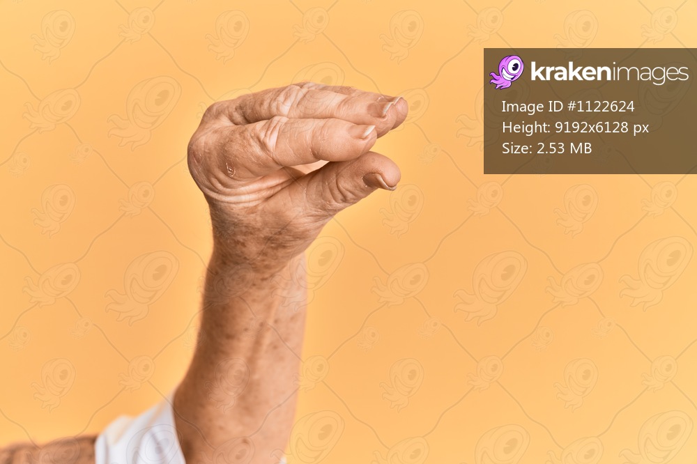 Senior caucasian hand over yellow isolated background picking and taking invisible thing, holding object with fingers showing space