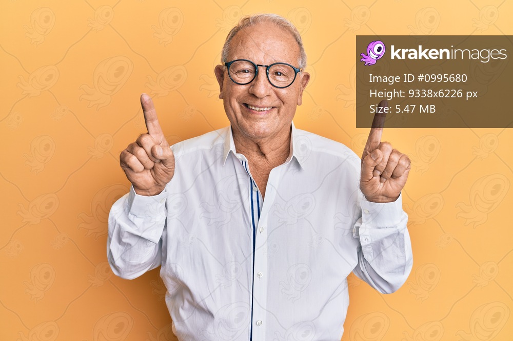 Senior caucasian man pointing up with fingers smiling with a happy and cool smile on face. showing teeth.