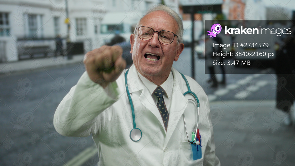 Senior doctor in uniform stands outdoors on a busy street, gesturing passionately, with urban surroundings and vehicles in the background, appearing focused and engaged. - Kraken Images