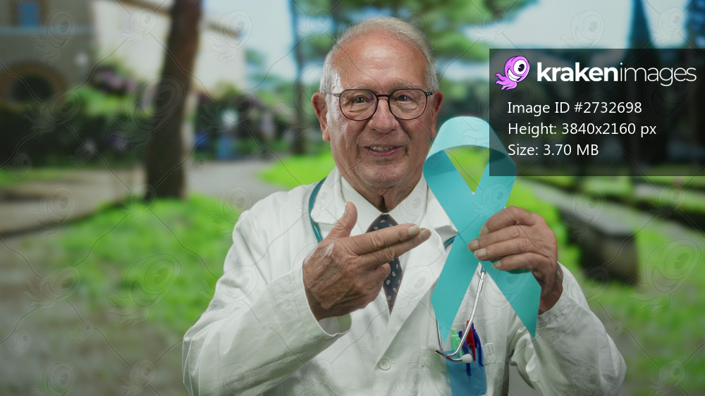Senior doctor man in uniform holding teal ribbon in an outdoor park setting, symbolizing awareness and health advocacy with a positive expression in a lush green environment. - Kraken Images