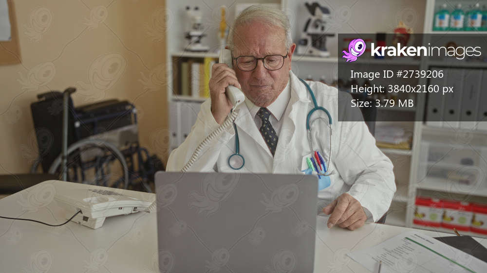 Senior doctor man in uniform talking on phone in clinic room with laptop and files visible, showcasing a professional indoor medical workplace environment. - Kraken Images