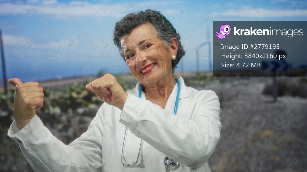 Senior female doctor with grey hair in a white coat and stethoscope outdoors near windmills in a field, pointing thumbs behind her under a bright blue sky. - Kraken Images