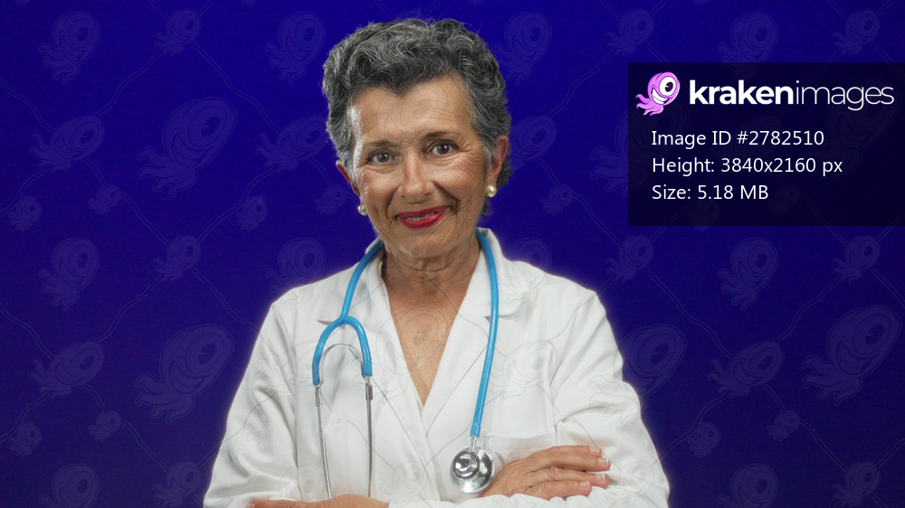 Senior female doctor in white coat with stethoscope poses confidently against a blue background, exuding professionalism and warmth, suitable for healthcare themes. - Kraken Images