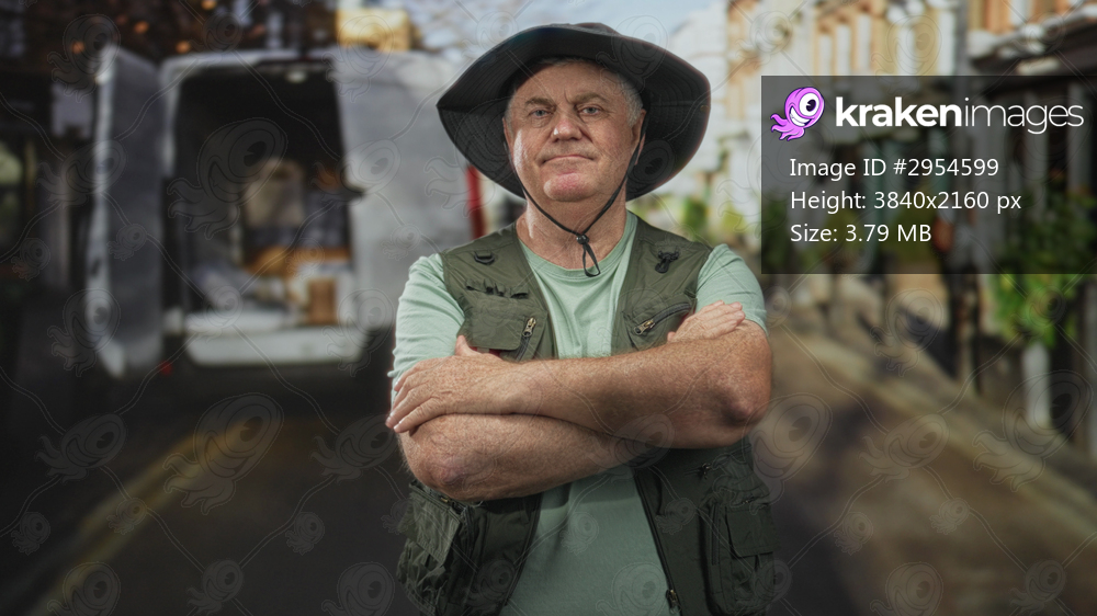 Senior fisherman with crossed forearms wearing wide brim hat and utility vest on a street beside an open delivery van; resilience solitude.