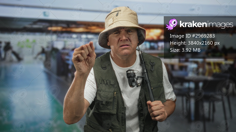 Senior fisherman man with bucket hat and white tee, green fishing vest holding telescopic rod and reel, right hand pinching near face in an airport food court; confusion. - Kraken Images