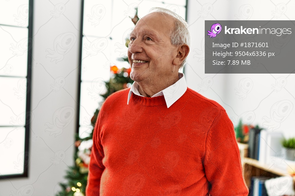 Senior grey-haired man smiling happy celebrating christmas standing at home.