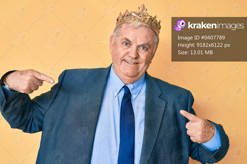 Senior grey-haired man wearing business suit and king crown looking confident with smile on face, pointing oneself with fingers proud and happy.