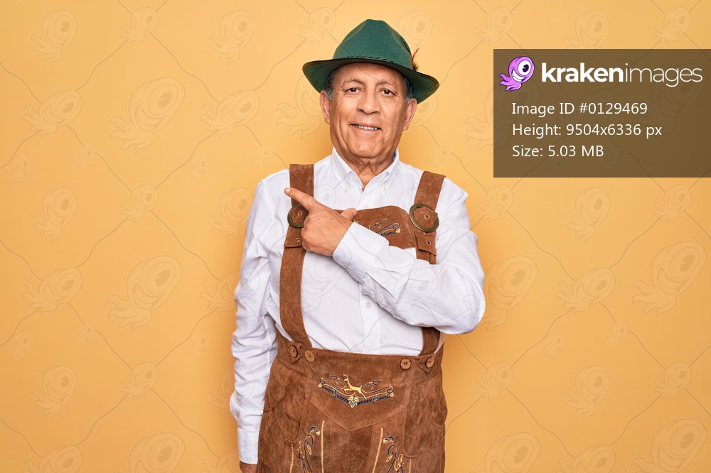 Senior grey-haired man wearing german traditional octoberfest suit over yellow background cheerful with a smile on face pointing with hand and finger up to the side with happy and natural expression - Kraken Images