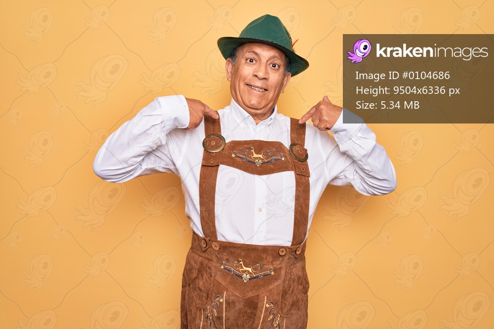 Senior grey-haired man wearing german traditional octoberfest suit over yellow background looking confident with smile on face, pointing oneself with fingers proud and happy. - Kraken Images