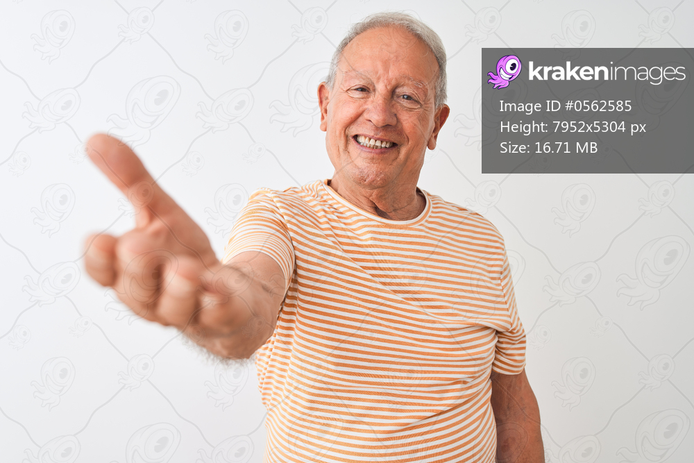 Senior grey-haired man wearing striped t-shirt standing over isolated white background smiling cheerful offering palm hand giving assistance and acceptance. - Kraken Images