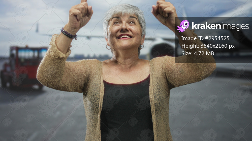 Senior grey haired plus size woman pointing both index fingers up beside a parked airplane on airport tarmac while smiling broadly; joy curiosity.