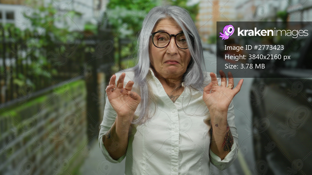 Senior grey-haired woman with glasses making playful gesture on a city street, blending seriousness with humor, against a backdrop of urban greenery and parked cars. - Kraken Images