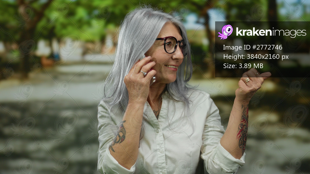 Senior grey-haired woman with glasses smiling and gesturing in a sunny park, wearing casual clothes and showing tattoos, creates a lively and engaging outdoor scene. - Kraken Images