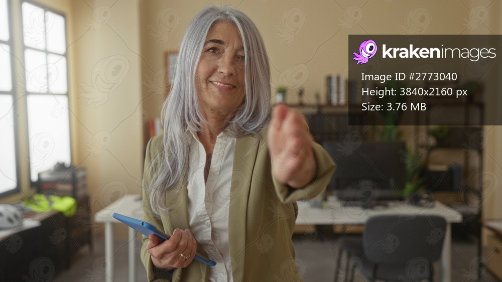 Senior grey-haired woman in an office setting extends her hand with a smile, holding a tablet, surrounded by books and office furniture, creating a professional yet friendly ambiance. - Kraken Images