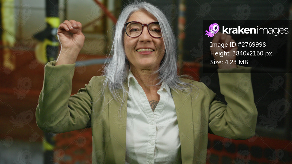 Senior grey-haired woman smiling at construction site indoors wearing glasses and formal attire, suggesting professional engagement and happiness in an urban outdoor setting. - Kraken Images