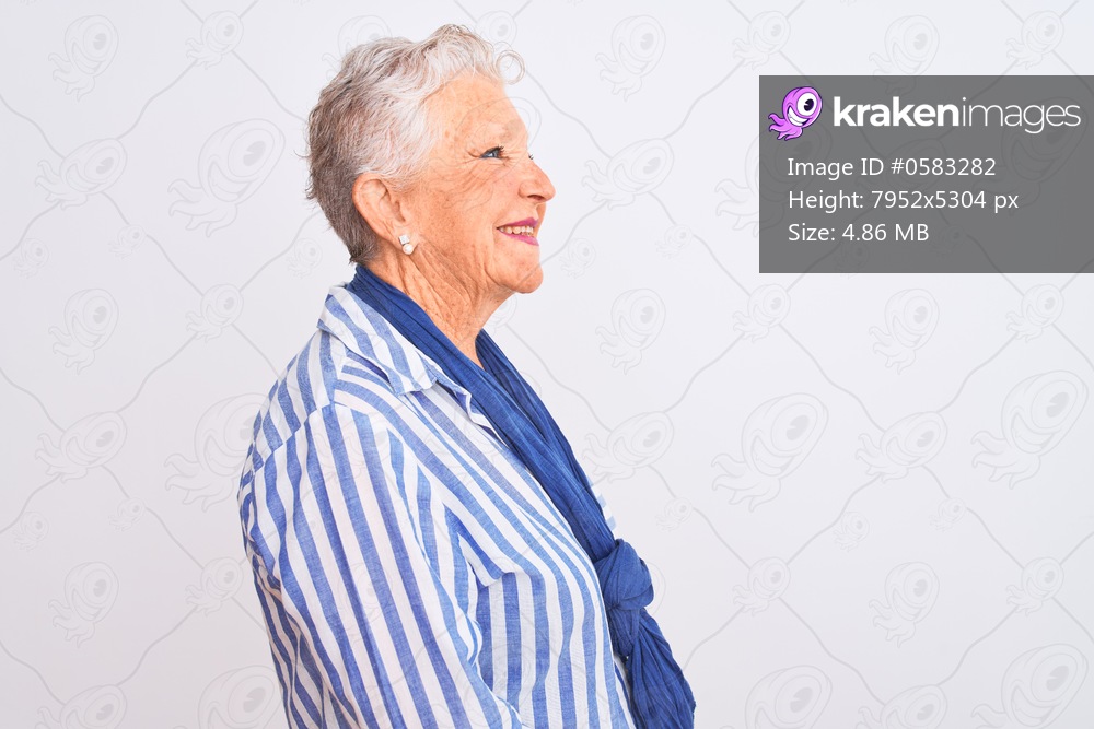 Senior grey-haired woman wearing blue striped shirt standing over isolated white background looking to side, relax profile pose with natural face with confident smile. - Kraken Images