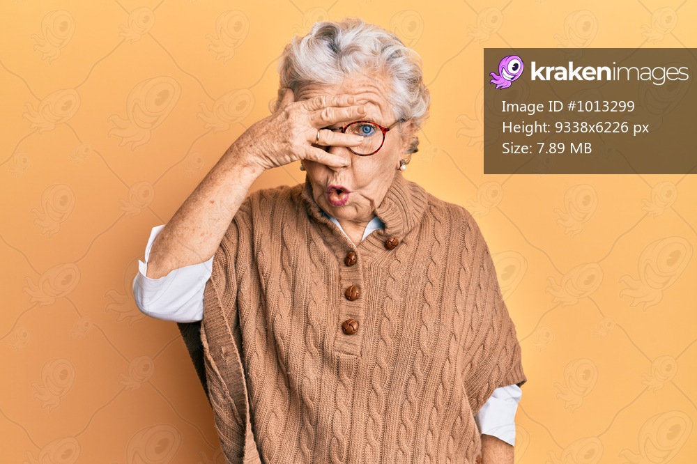 Senior grey-haired woman wearing casual clothes and glasses peeking in shock covering face and eyes with hand, looking through fingers with embarrassed expression. - Kraken Images