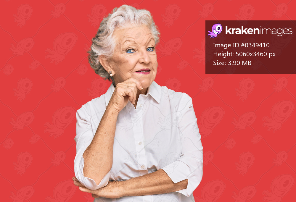 Senior grey-haired woman wearing casual clothes looking confident at the camera with smile with crossed arms and hand raised on chin. thinking positive. - Kraken Images