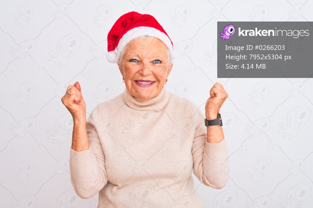 Senior grey-haired woman wearing Crhistmas Santa hat over isolated white background celebrating mad and crazy for success with arms raised and closed eyes screaming excited. Winner concept - Kraken Images