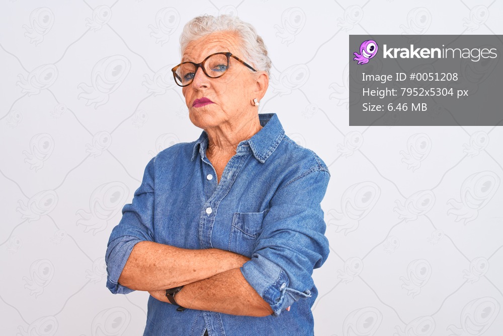 Senior grey-haired woman wearing denim shirt and glasses over isolated white background looking to the side with arms crossed convinced and confident
