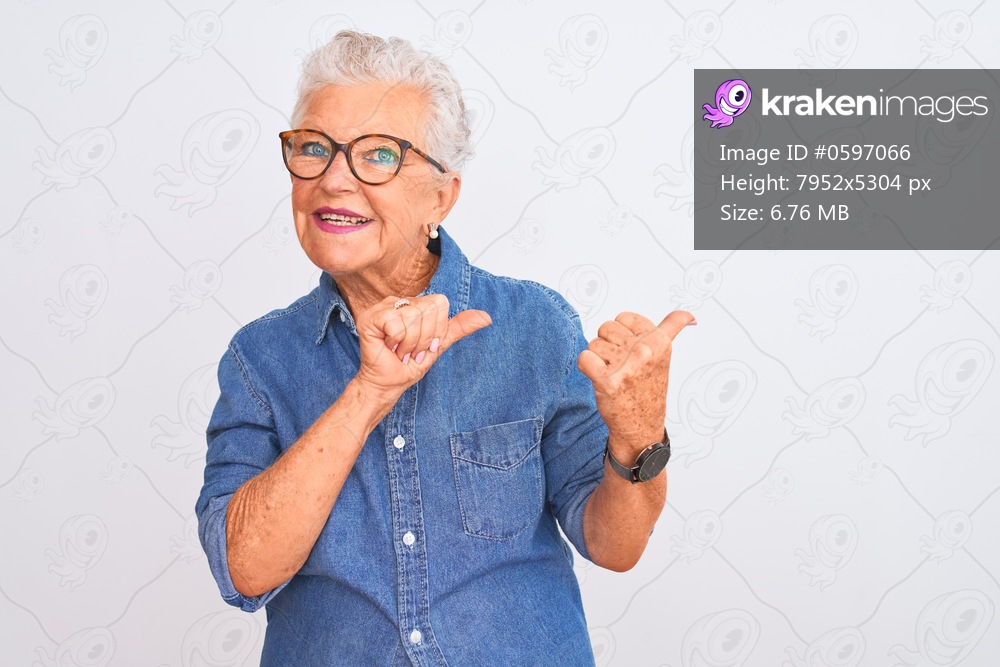 Senior grey-haired woman wearing denim shirt and glasses over isolated white background Pointing to the back behind with hand and thumbs up, smiling confident - Kraken Images