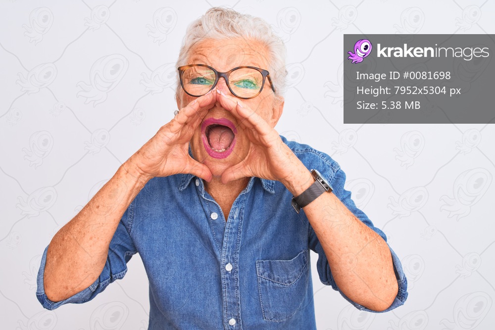 Senior grey-haired woman wearing denim shirt and glasses over isolated white background Shouting angry out loud with hands over mouth