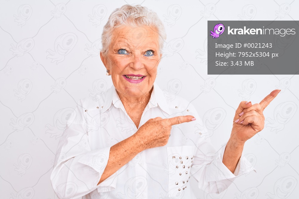 Senior grey-haired woman wearing elegant shirt standing over isolated white background smiling and looking at the camera pointing with two hands and fingers to the side. - Kraken Images