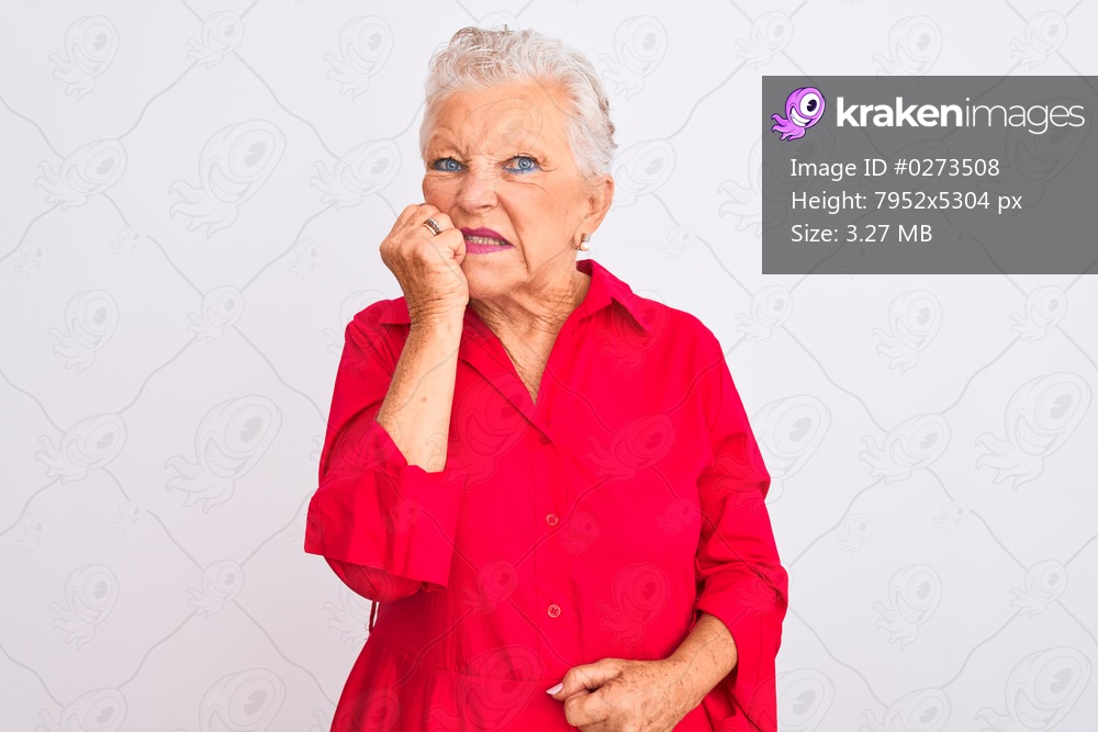 Senior grey-haired woman wearing red casual shirt standing over isolated white background looking stressed and nervous with hands on mouth biting nails. Anxiety problem. - Kraken Images