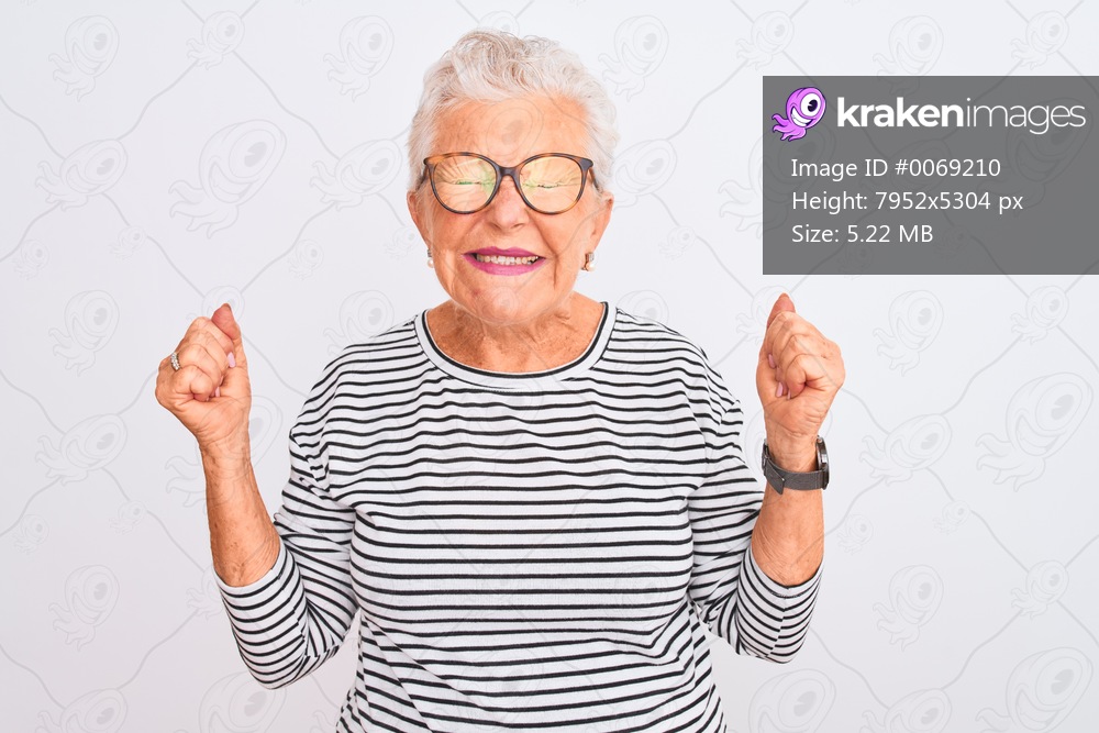 Senior grey-haired woman wearing striped navy t-shirt glasses over isolated white background celebrating mad and crazy for success with arms raised and closed eyes screaming excited. Winner concept - Kraken Images