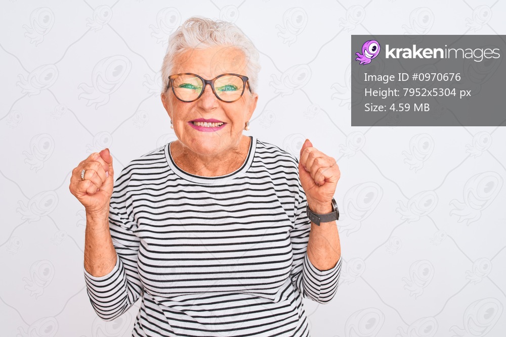 Senior grey-haired woman wearing striped navy t-shirt glasses over isolated white background excited for success with arms raised and eyes closed celebrating victory smiling. Winner concept. - Kraken Images