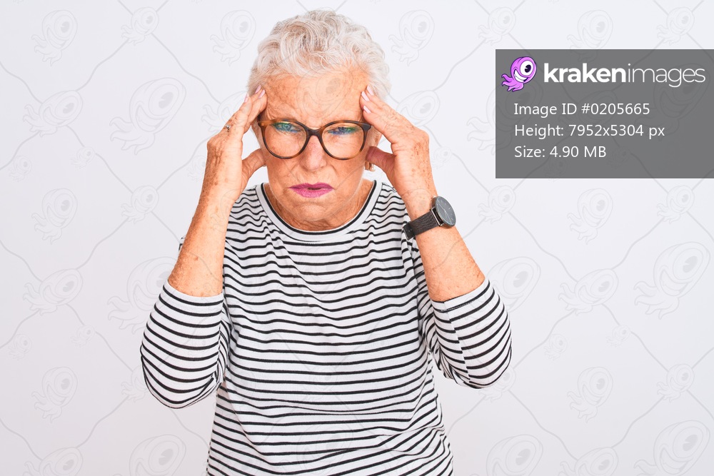 Senior grey-haired woman wearing striped navy t-shirt glasses over isolated white background with hand on head for pain in head because stress. Suffering migraine. - Kraken Images