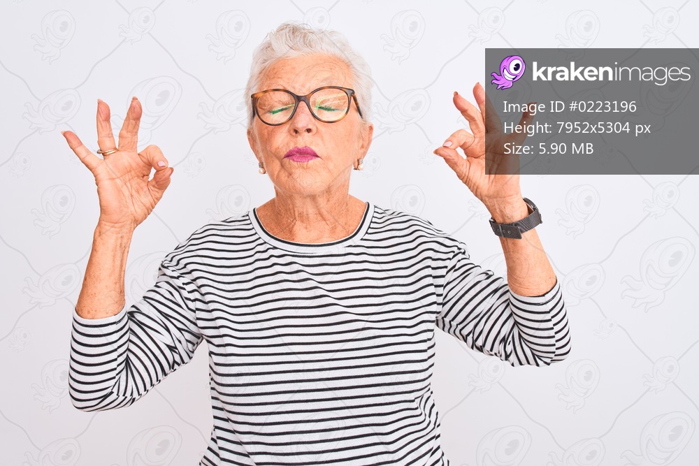 Senior grey-haired woman wearing striped navy t-shirt glasses over isolated white background relax and smiling with eyes closed doing meditation gesture with fingers. Yoga concept. - Kraken Images