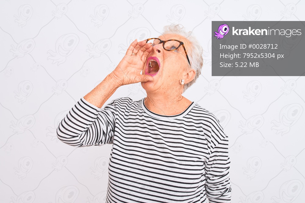 Senior grey-haired woman wearing striped navy t-shirt glasses over isolated white background shouting and screaming loud to side with hand on mouth. Communication concept. - Kraken Images
